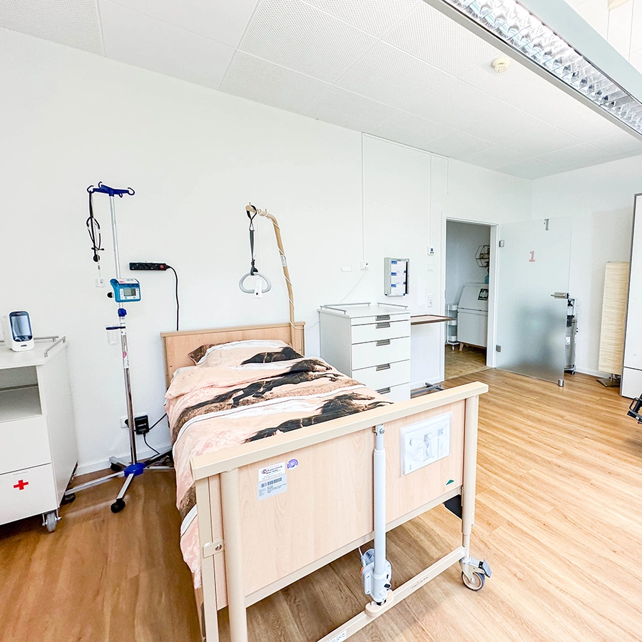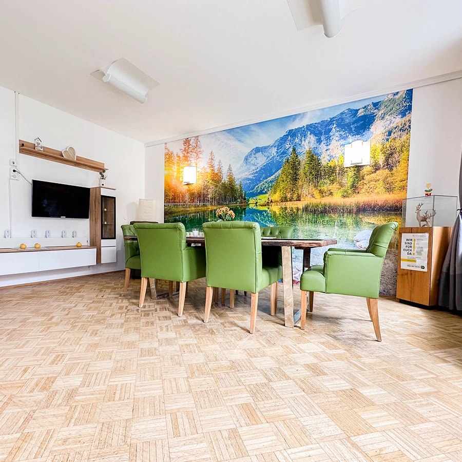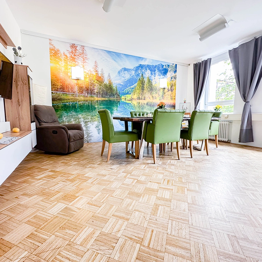 Seit 2018 befindet sich unsere Intensivpflege-Wohngemeinschaft in Würzburg im Erdgeschoss eines ehemaligen Verlagsgebäudes und bietet Platz für bis zu zehn Bewohner*innen. Die Zimmer sind großzügig ausgestattet, dazu gibt es liebevoll gestaltete öffentliche Bereiche mit Rückzugsnischen für Bewohner*innen und Angehörige. Der Außenbereich bietet bequeme Sitzmöglichkeiten und einen herrlichen Blick auf die Festung Marienberg, die aus dem 13. Jahrhundert stammt. Das besondere an der Wohnungsgemeinschaft: Die Pflegekräfte dürfen nach Absprache ihre Hunde mit zur Arbeit bringen. Das bringt Schwung in die Wohngemeinschaft.